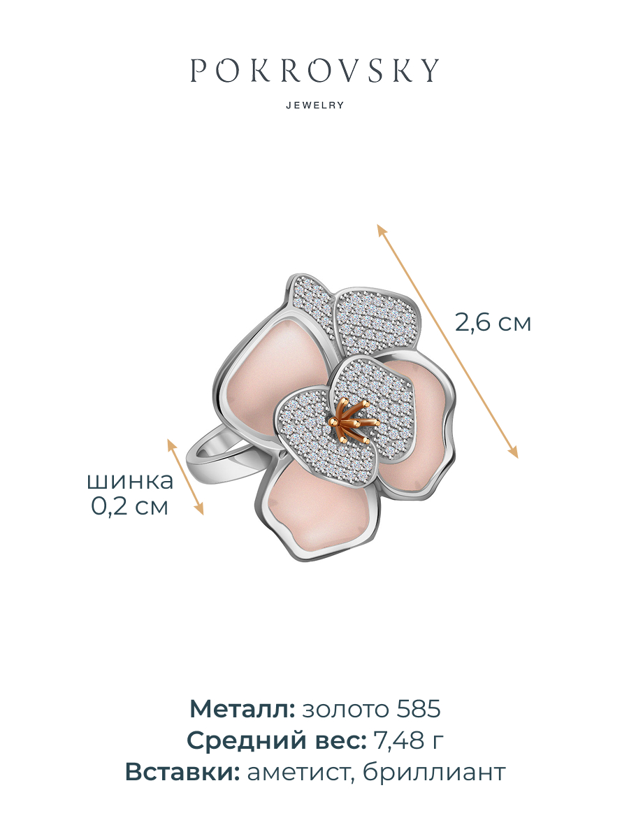 Кольцо эйфория из белого золота 585 с аметистами и бриллиантами