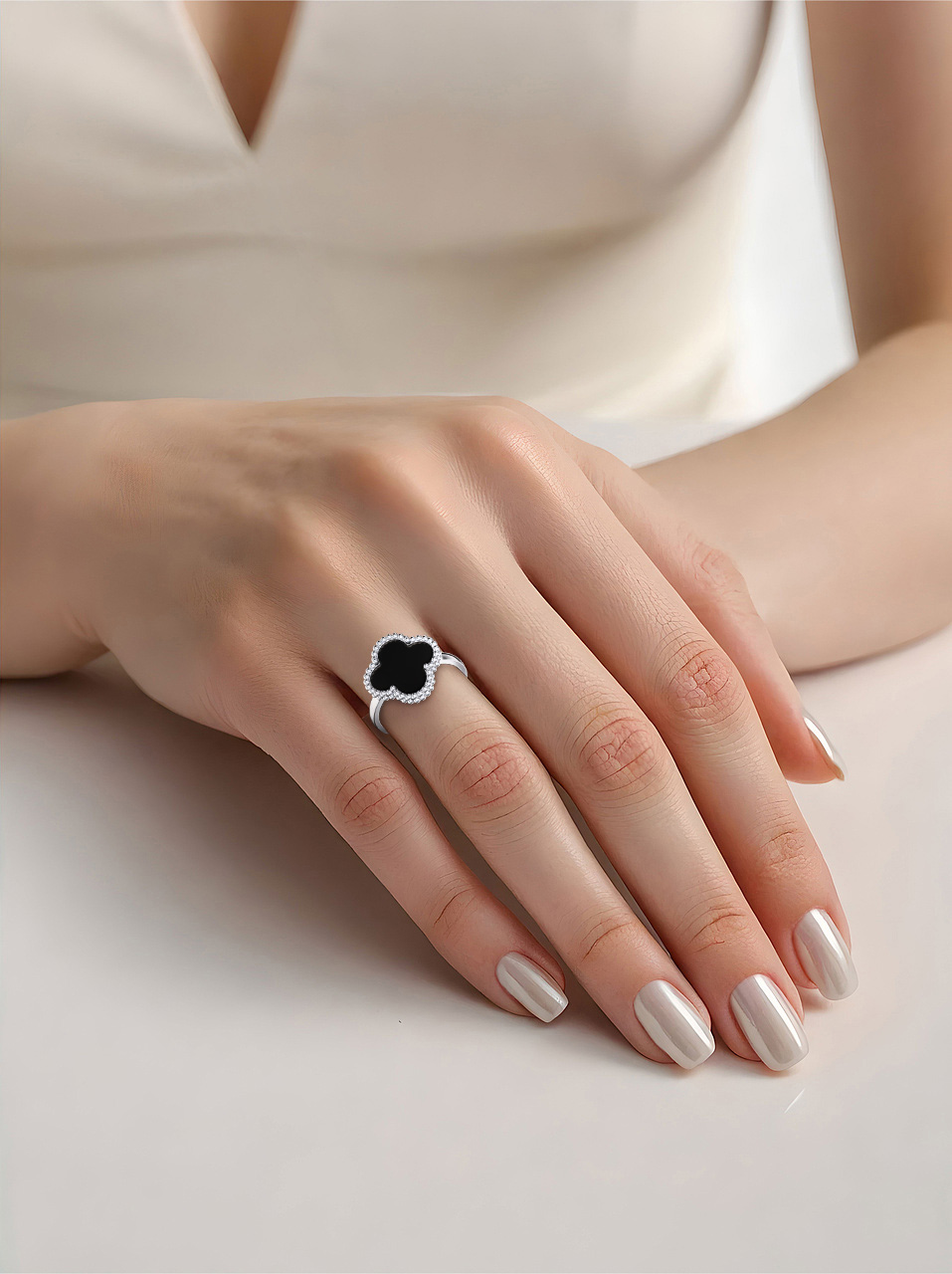 Кольцо клевер серебряное 925 с черным агатом 0101809-00185