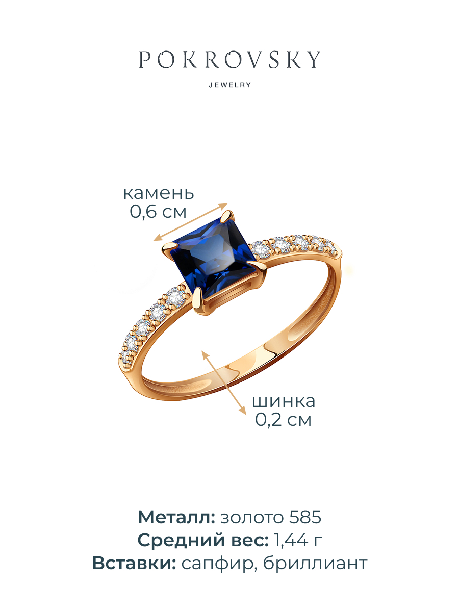Кольцо 0101812-00050 Au 585 (2020263231759 (10 Бр. кр57 (1,50) 0,14 ct 4/5 /А ,1 Сапф. квадрат 5,00*5,00 0,85 ct 2/2 синий))