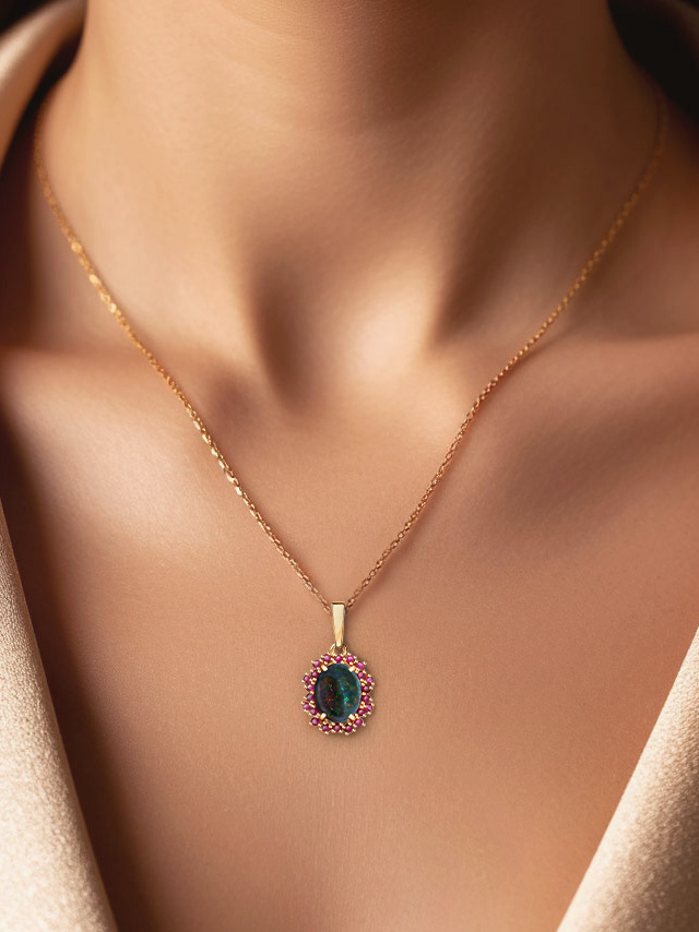 Подвеска золотая 585 с зеленым опалом и рубинами