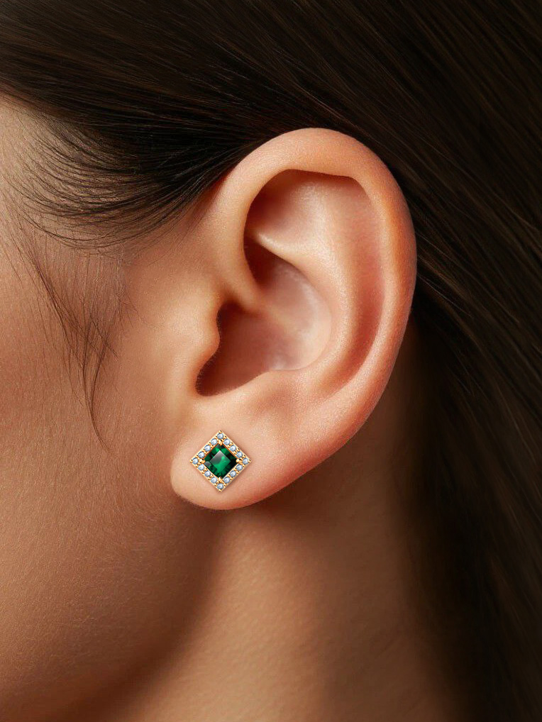 Серьги пусеты золотые 585 квадратные с изумрудами и бриллиантами 6101095-02720
