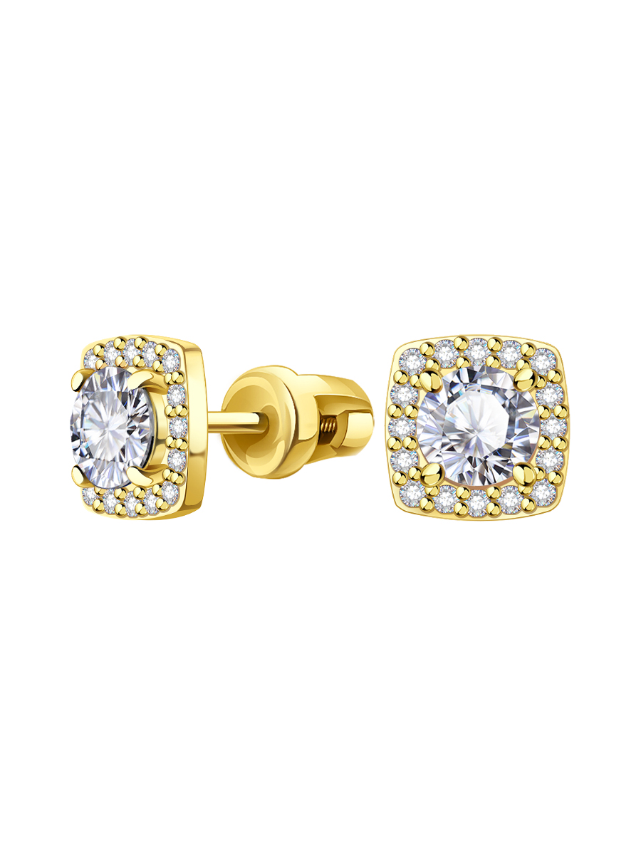 Серьги пусеты золотые 585 квадратные с камнями фианитами