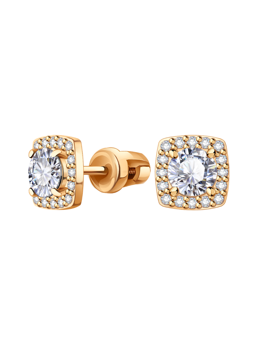 Серьги пусеты золотые 585 квадратные с камнями фианитами