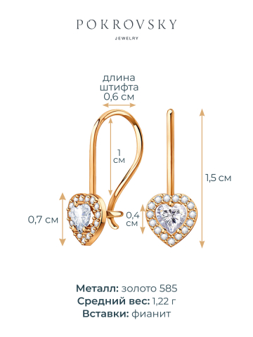 Серьги 0201716-00770 Au 585 (2020244251813(30 Фиан. кр. 1,00 0,06 г. ,2 Фиан. сердце 4,00*4,00 0,158 г.))