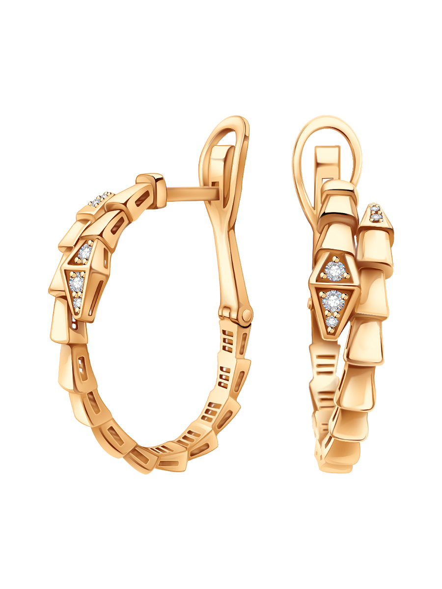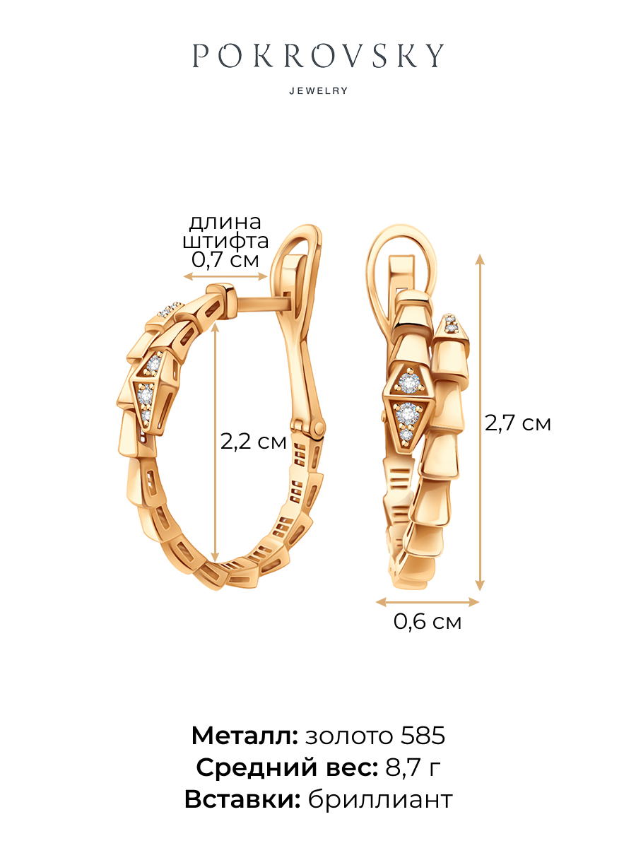 Серьги кольца золотые 585 змеи с бриллиантами 27 мм 9201382-00000