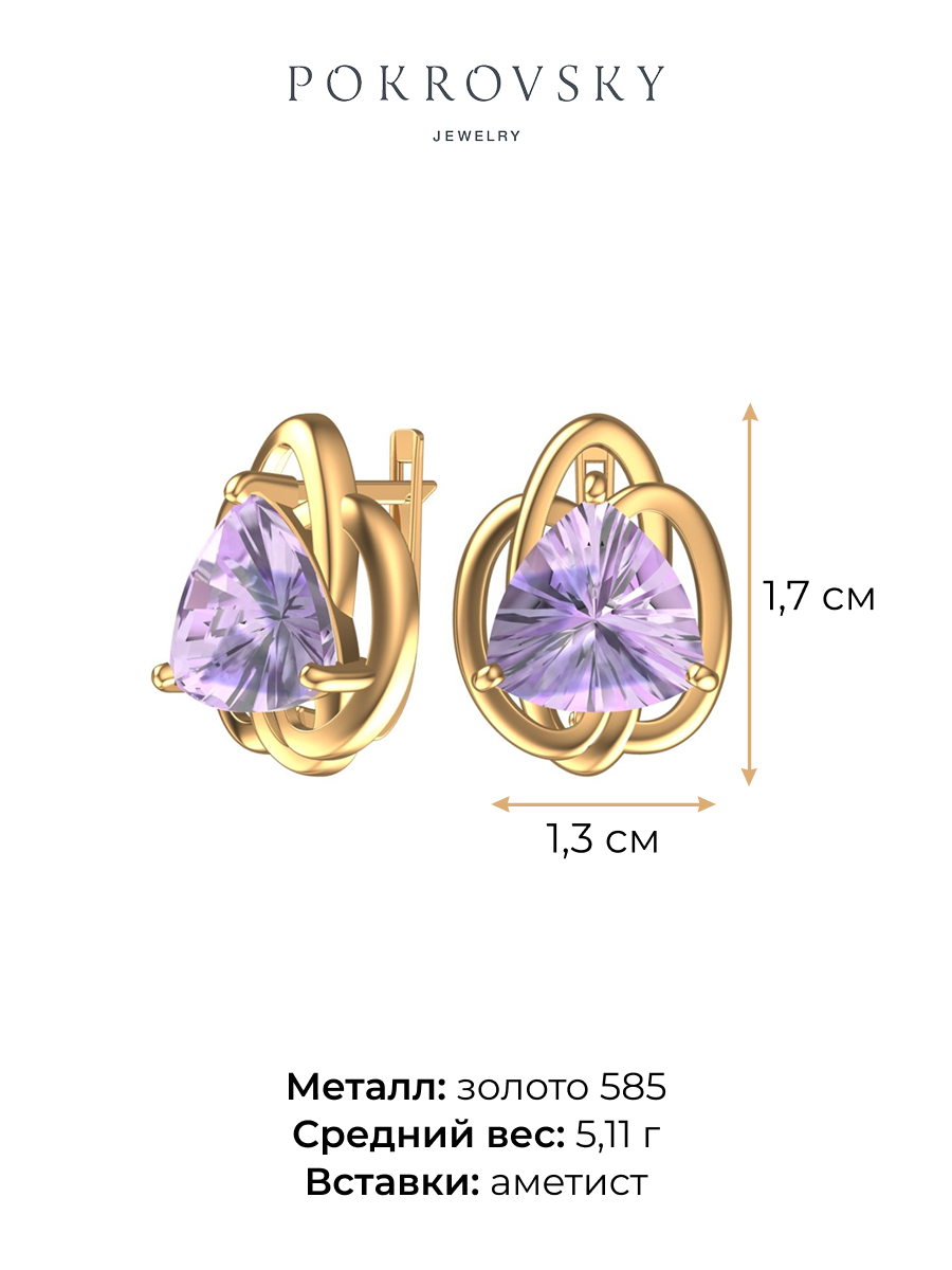 Серьги с природными аметистами изготовлены из высококачественного классического красного золота 585 пробы. Они отлично сидят на ушке за счет удобного английского замка. Необычный фантазийный дизайн этих серег добавляет шарма и элегантности Вашему вечернему образу. Они идеально подойдут для женщин и девушек. Красивый контраст красного золота и блестящих аметистов создает утонченный и стильный образ, идеально подчеркивающий вашу женственность. Тренд 2024! Оригинальный подарок крупных серег для вашей подруги, мамы или любимой. В комплекте идет подарочная упаковка. Покровский ювелирный завод производит стильные украшения в стиле минимализм уже более 20 лет под брендом POKROVSKY JEWELRY. Каждому изделию нашего производства присвоен УИН от пробирной палаты РФ, по которому можно проверить подлинность драгоценного металла.