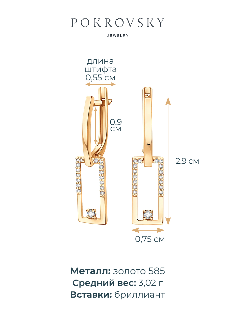 Серьги подвески золотые 585 квадраты с бриллиантами