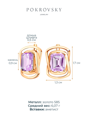 Серьги 2101262-00220 Au 585 (ШК: 2020050591295; Вставка: 2 Амет. октагон 9,00*7,00 3,94 ct; Вес: 6,07)