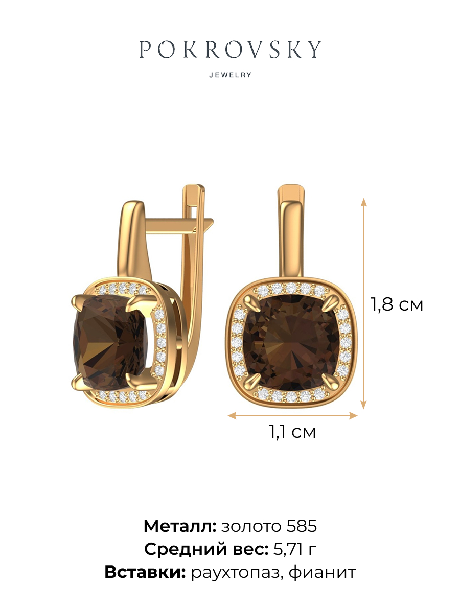 Серьги 2101200-00630 Au 585 (ШК: 2020051710251; Вставка: 2 Кварц дымч. кушон 10,00*10,00 4,7 ct ,48 Фиан. кр. 1,00 0,096 г.; Вес:)