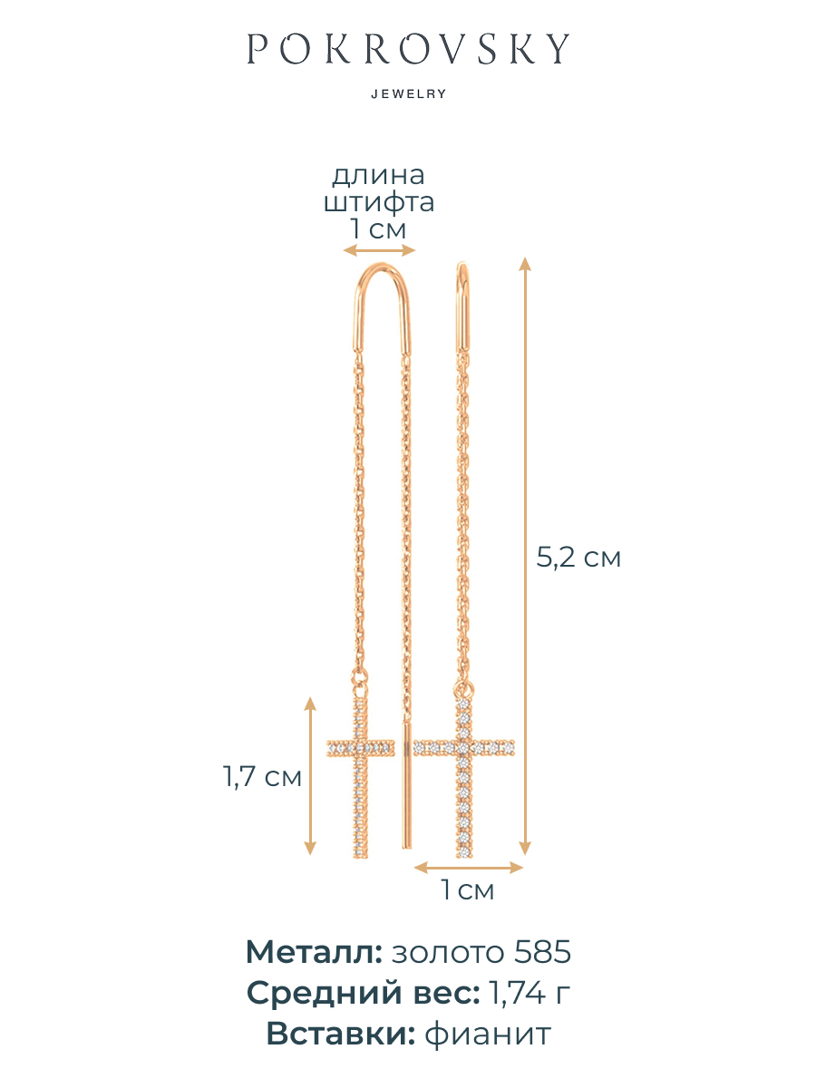 Серьги протяжки золотые 585 крестики с камнями фианитами