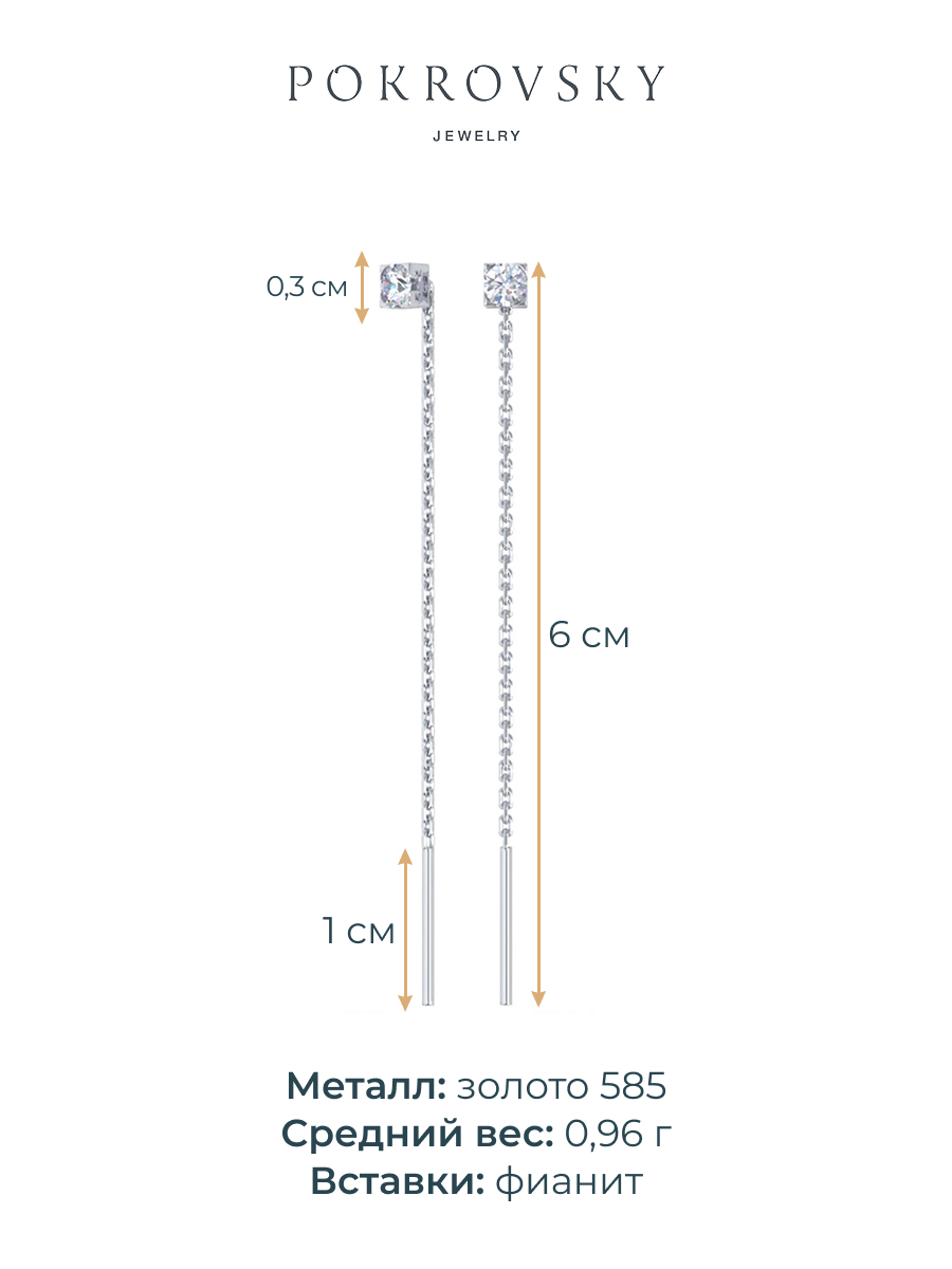 Серьги цепочки из белого золота 585 с камнями фианитами